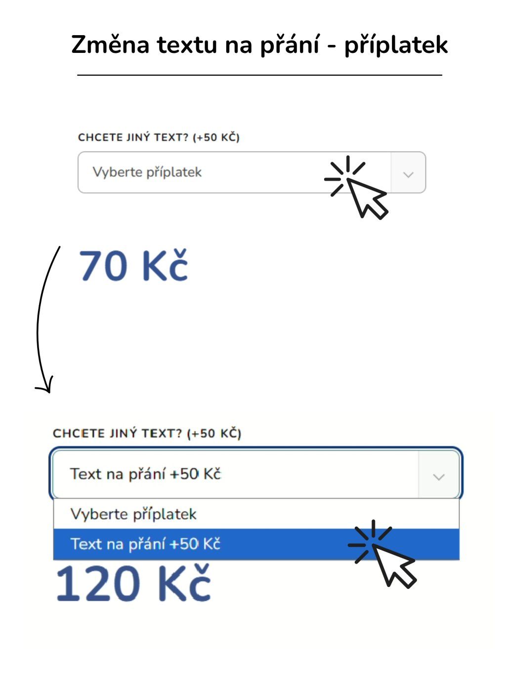 1) Zde v detailu produktu zvolte příplatek "Chcete jiný text? → Text na přání +50 Kč".